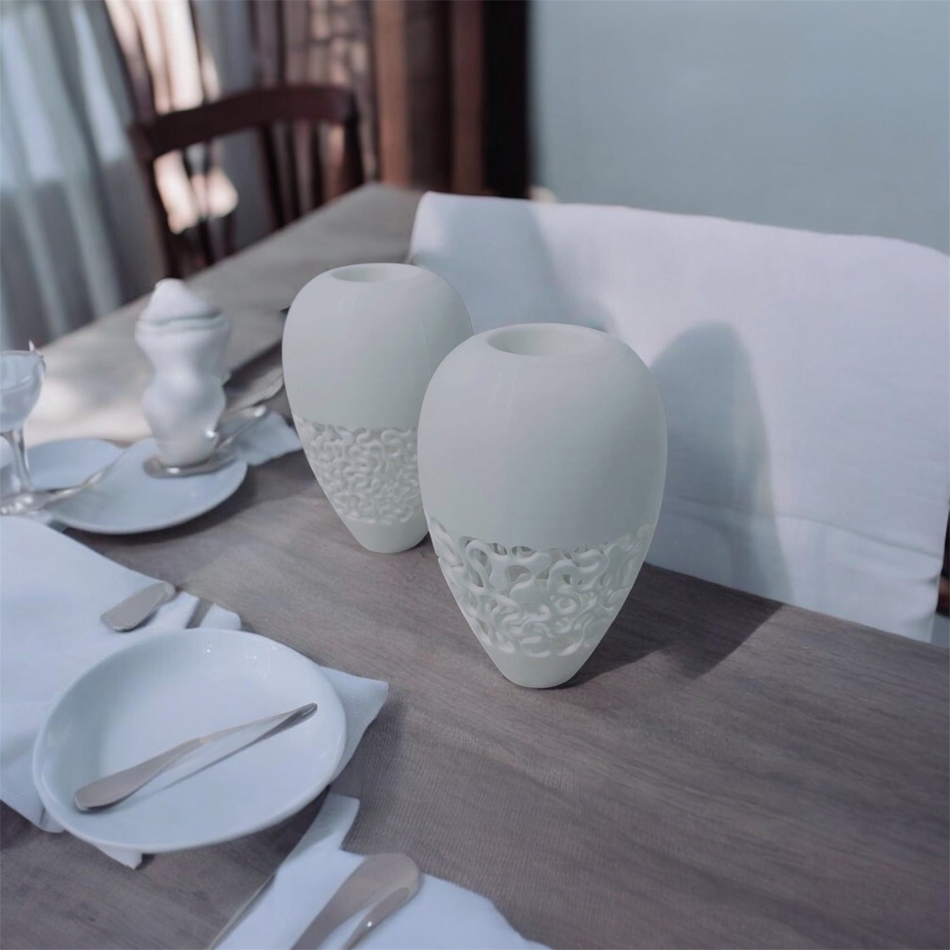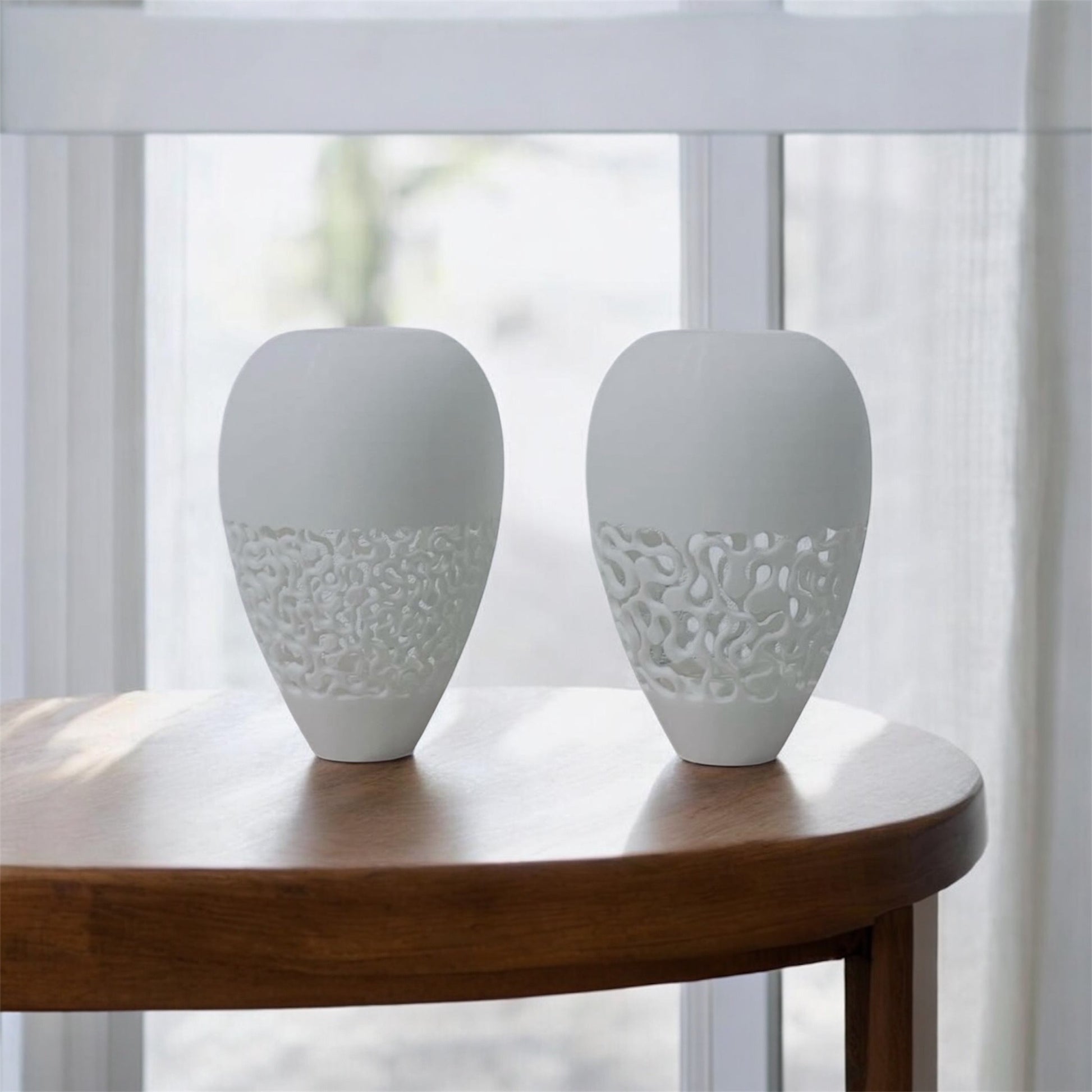 丸みを帯びたやわらかなフォルムを持ち、日常の中で気軽に花を飾ることのできる扱いやすいサイズ感にデザインされています。デスク、キッチンや食卓、洗面、キャビネットなど、さまざまな日常の場面に自然と溶け込みます。小さな花や枝物を静かに引き立てながら、空間にささやかなリズムを生み出します。